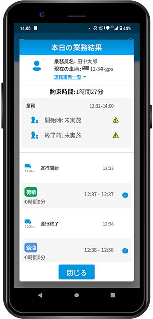 1回の業務中に複数の車両を運行することが可能です。また、1台の車両に2名のドライバーが乗車した場合にも対応しています。