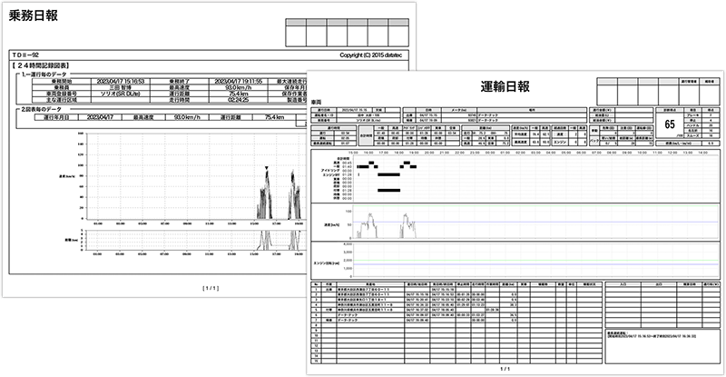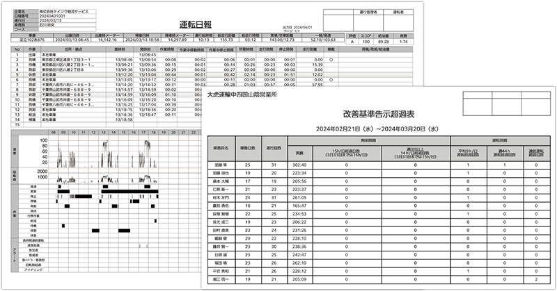 デジタコで取得したデータをもとに自動で各種レポートを生成します。「運転日報」「乗務員別労働実績明細表」「乗務員別労働実績一覧表」「改善基準告示超過表」「車両別稼働実績明細表」「車両別稼働実績一覧表」「安全運転レポート」「安全運転実績」「安全運転スコア」「燃費一覧」のレポートが自動生成されます。