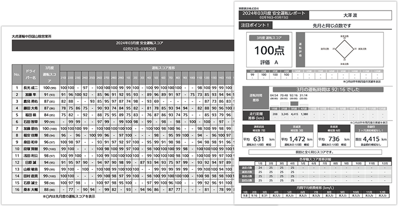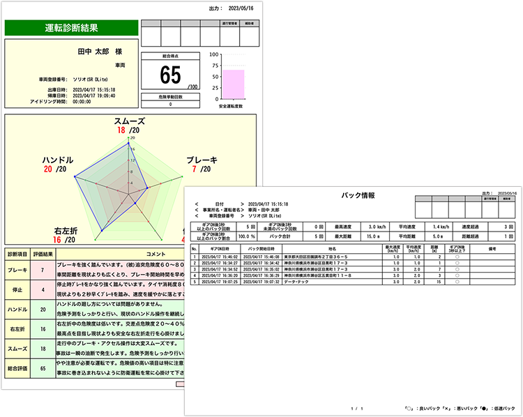 ドライバーの安全運転・エコ運転を分析しレポート化します。現在の運転レベル、運転改善状況が一目で分かるのでドライバーとのコミュニケーションツールとしても活用できます。