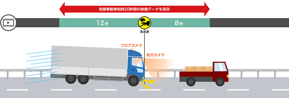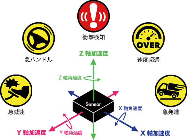 Hazardous behaviour is detected at precise speeds using a 3-axis acceleration sensor and vehicle speed pulses. In addition, remote video acquisition is possible.