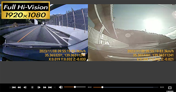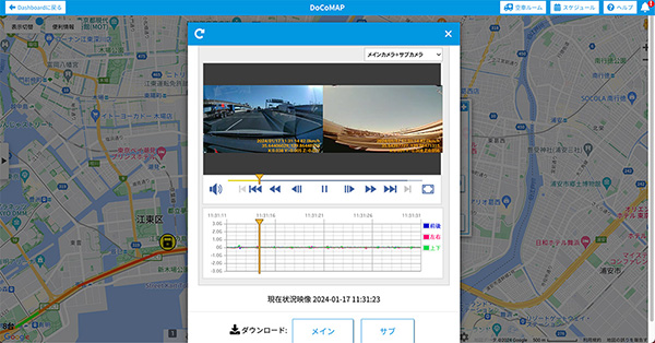 docomapEye automatically uploads 20 seconds of video and audio to the cloud when sharp turns, sudden acceleration/deceleration, or collision is detected (12 seconds before the detection, and 8 seconds after). You can view the uploaded video at any time from the DoCoMAP screen.