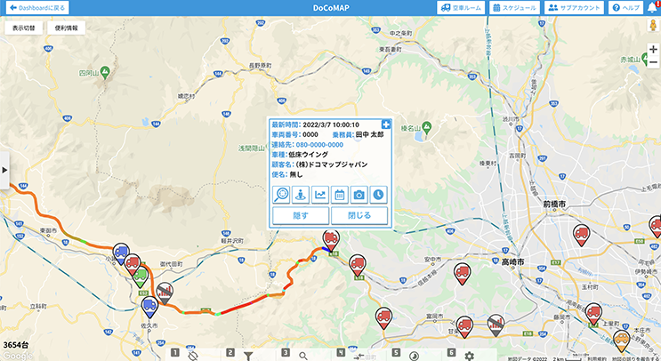 DoCoMAP can display and manage the location of vehicles on familiar GoogleMaps; in conjunction with PALTEK's GPS Tracker R, the aerial photo mode of the map and Street View functions are also available, as well as the past year's location history.