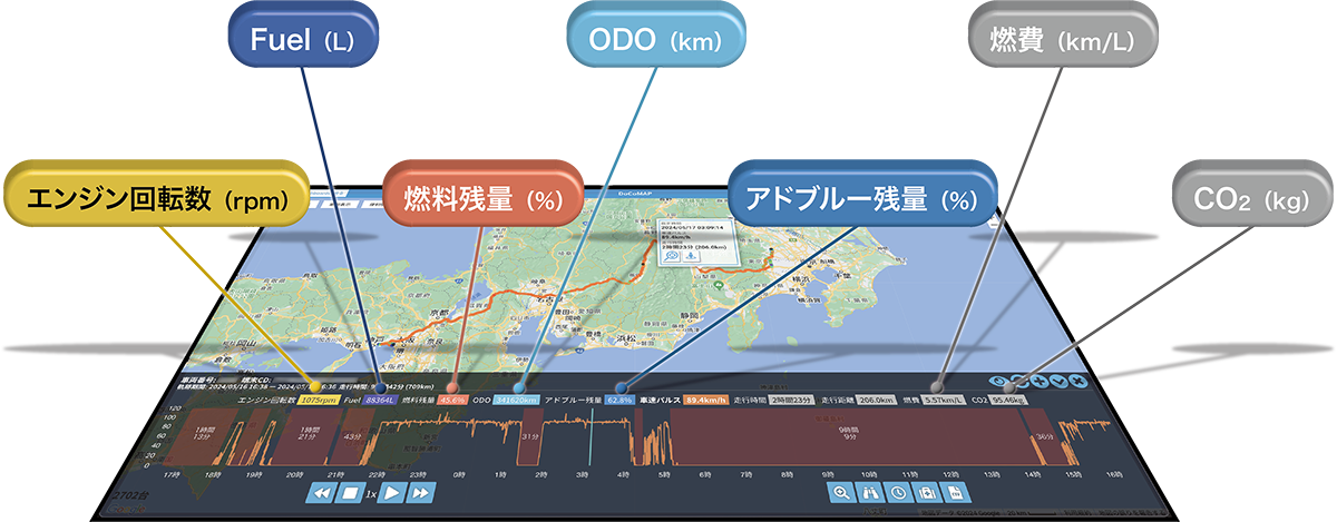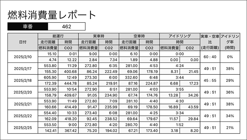 運行時の燃料消費量を実車時、空車時、アイドリング時で確認が可能、さらに実車・空車時の比率やアイドリング率も自動で出力可能になります。