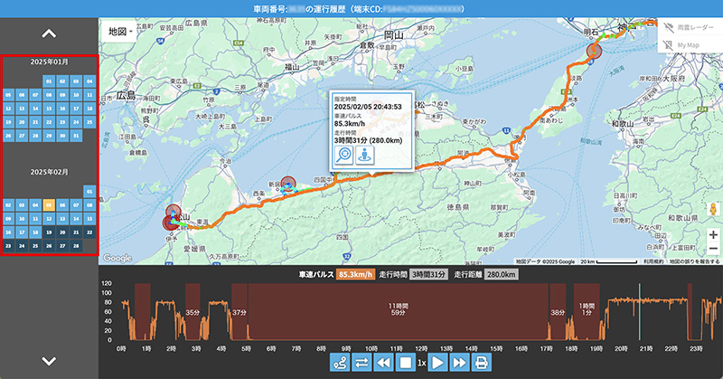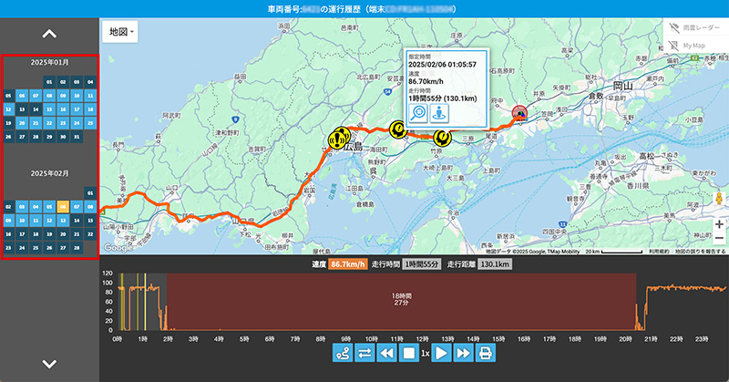 車両の走行した軌跡を地図上に表示すると同時に、 速度と時間が連動したグラフを表示したり、 過去1年分の履歴をカレンダーより簡単に呼び出し、確認することも可能です。