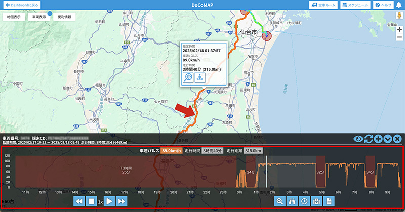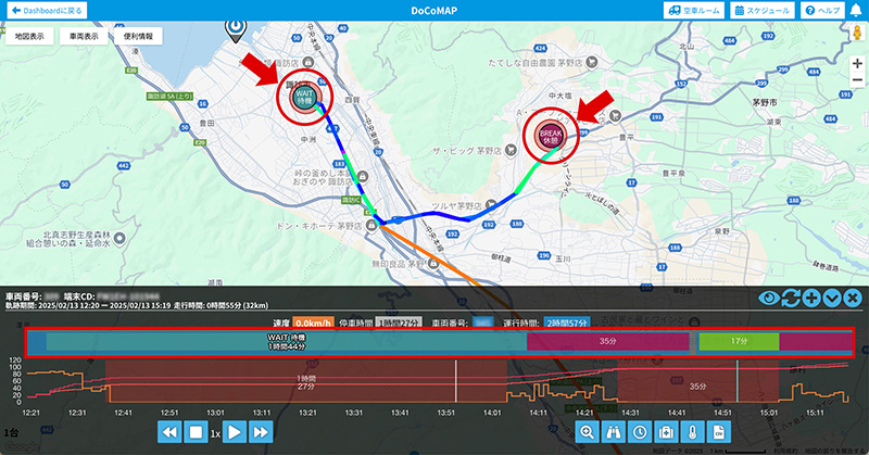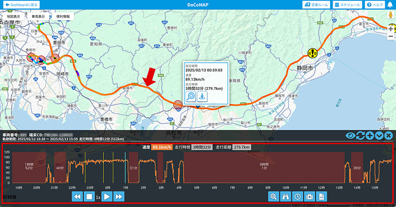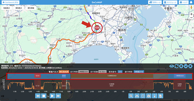 車両アイコンをクリックするだけで、簡単に車両の走行履歴が確認できます。車両の速度表示だけでなく、運行管理に必要な連続運転時間・休憩時間の管理がグラフにて容易に確認が出来ます。