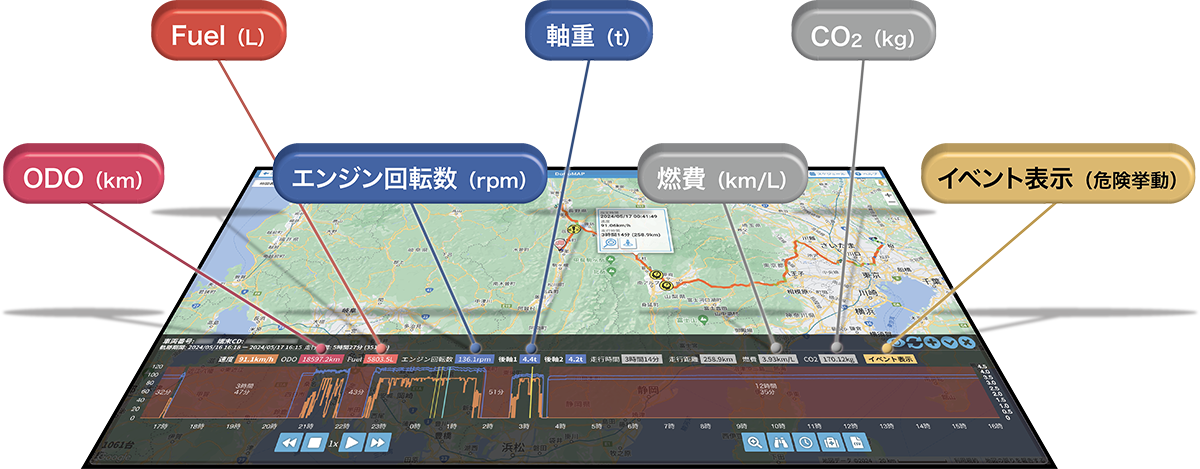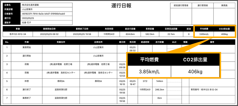 環境問題への対応をサポートするために、CO2排出量や燃費消費量を可視化する機能が搭載されています。この機能を利用することで、運送業務におけるエネルギー消費や環境負荷を管理し、脱炭素社会の実現に貢献できます。