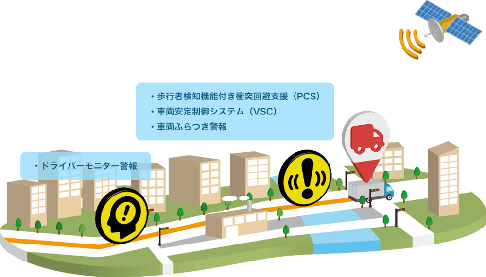 ドライバーの安全運転の意識向上に貢献した「ドライバーモニター警報情報」や「歩行者検知機能付き衝突回避支援」などの安全装置の作動状況をリアルタイムに確認できます。