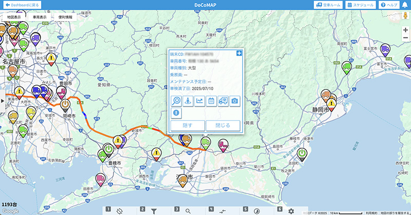 DoCoMAPでは、慣れ親しんだGoogleMaps上に車両の位置を表示し管理することが可能です。GoogleMapsの機能を利用して、渋滞情報やストリートビューなどの機能を直接利用することも可能です。