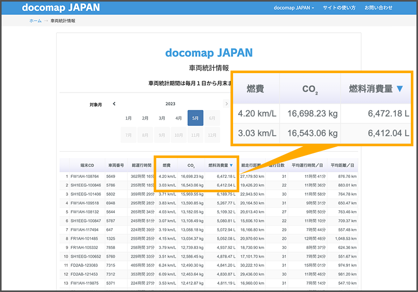 HINO-CONNECTから取得した情報をもとに「平均燃費」や「CO2排出量」をDoCoMAP上や出力する運行日報で見える化することが可能なため、環境問題に取組む企業へサポートができます。