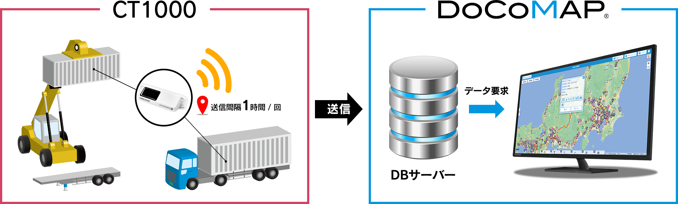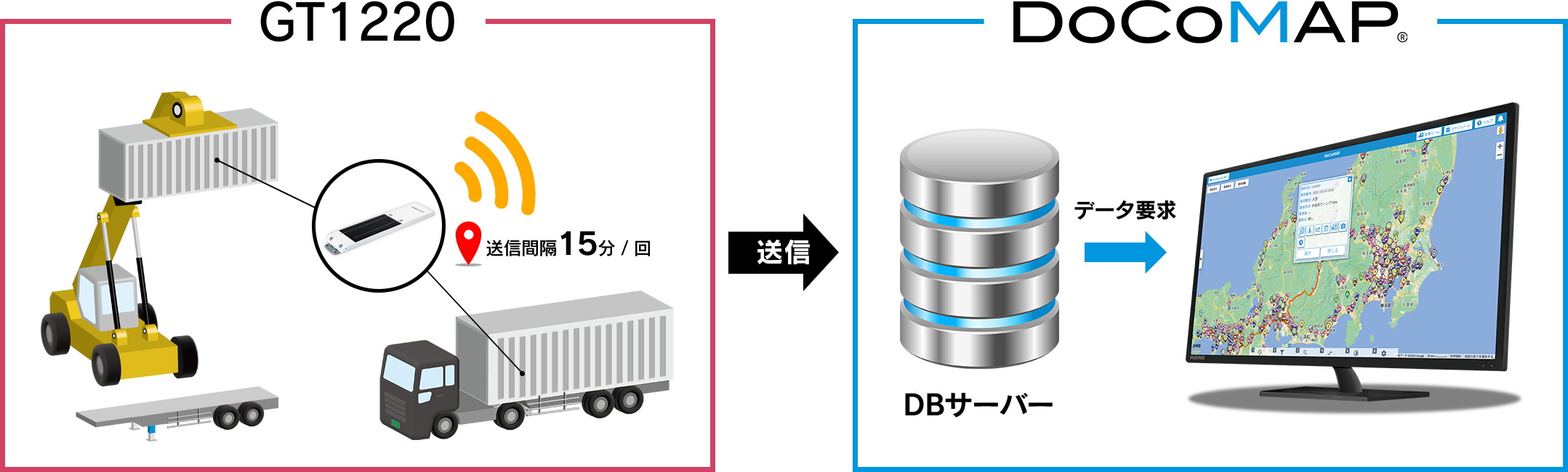 ZF Aftermarketの「docomap Trailer」専用端末「SCALAR EVO Pulse」を該当のトレーラーに取り付けるだけで、リアルタイム位置情報をDoCoMAP上で確認することができます。トレーラヘッドに、DoCoMAP専用端末、「docomap GPS」「docomap Eye」「docomap Vehicle」などを取付けることでヘッドとトレーラ併せてDoCoMAP地図上で動態管理を行うことが可能です。