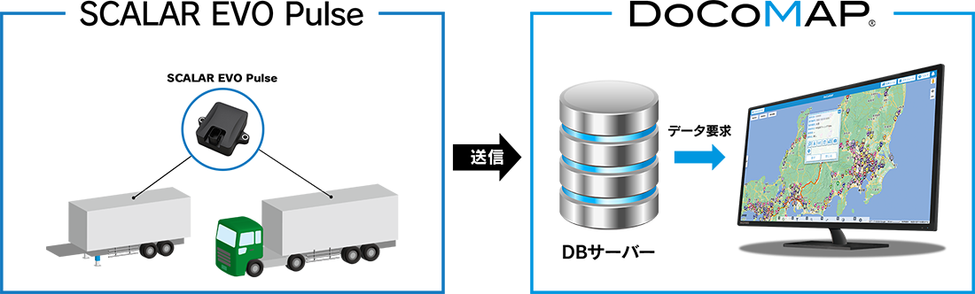 ZF Aftermarketの「docomap Trailer」専用端末「SCALAR EVO Pulse」を該当のトレーラーに取り付けるだけで、リアルタイム位置情報をDoCoMAP上で確認することができます。トレーラヘッドに、DoCoMAP専用端末、<a href="https://www.docomap.jp/gps2" target="_blank">「docomap GPS」</a><a href="https://www.docomap.jp/eyes" target="_blank">「docomap Eye」</a><a href="https://www.docomap.jp/hino" target="_blank">「docomap Vehicle」</a>などを取付けることでヘッドとトレーラ併せてDoCoMAP地図上で動態管理を行うことが可能です。
